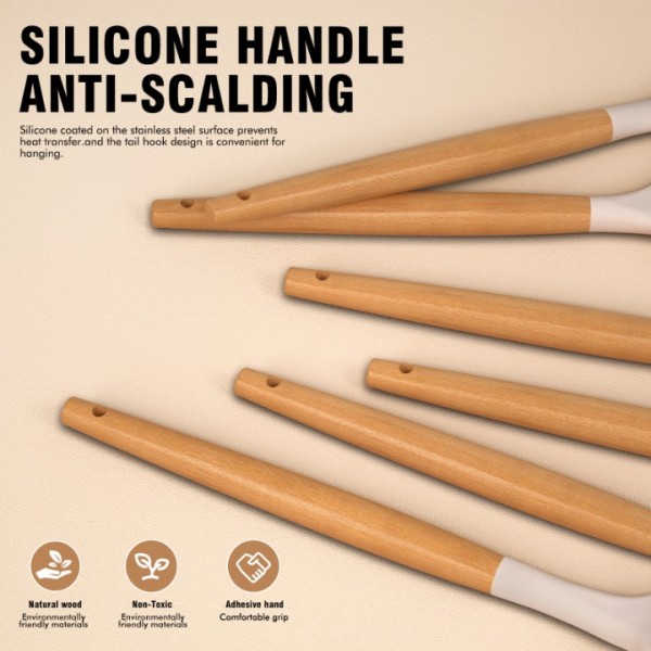 - HEAT-RESISTANT & NON-MELTING: These silicone kitchen utensils set withstand temperatures up to a sizzling 446�F, even during high-temperature frying. Silicone doesn't melt and does not react with food. High-quality natural wood prevents the transfer of heat during cooking. The small round hole at the end facilitates hanging to eliminate clutter. Please note that each silicone kitchen utensil wooden handle has a slightly different color and texture